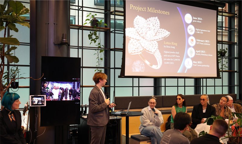 登壇では、デジタルジュエリーの特徴やブロックチェーンを用いた所有と採掘の仕組み、さらにゲーム内での体験価値について紹介。とくに、来場者がその場でジュエリーを簡単にデザインできるインタラクティブ性が評価され、ファッション業界やWeb3関係者の関心を引きました。